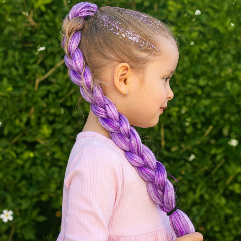 Child with purple braided hair and sparkly hair standing against a green hedge.