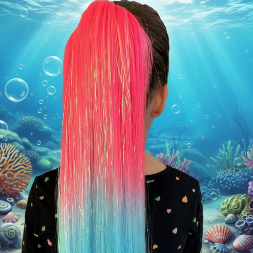Transform your little one into a magical princess with Mermaid Hair Kids hair extensions with tinsel. Designed especially for kids, these reusable tie-in hair extensions are lightweight, colorful, and easy to attach for instant princess-style hair.