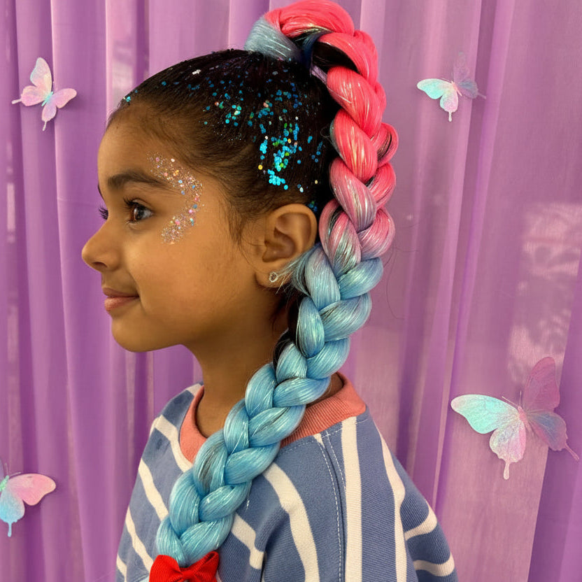 Made from premium synthetic fiber, this hair extension blends beautifully into natural hair and adds a shimmering tinsel finish that kids love. Perfect for dress-ups, parties, and themed events.